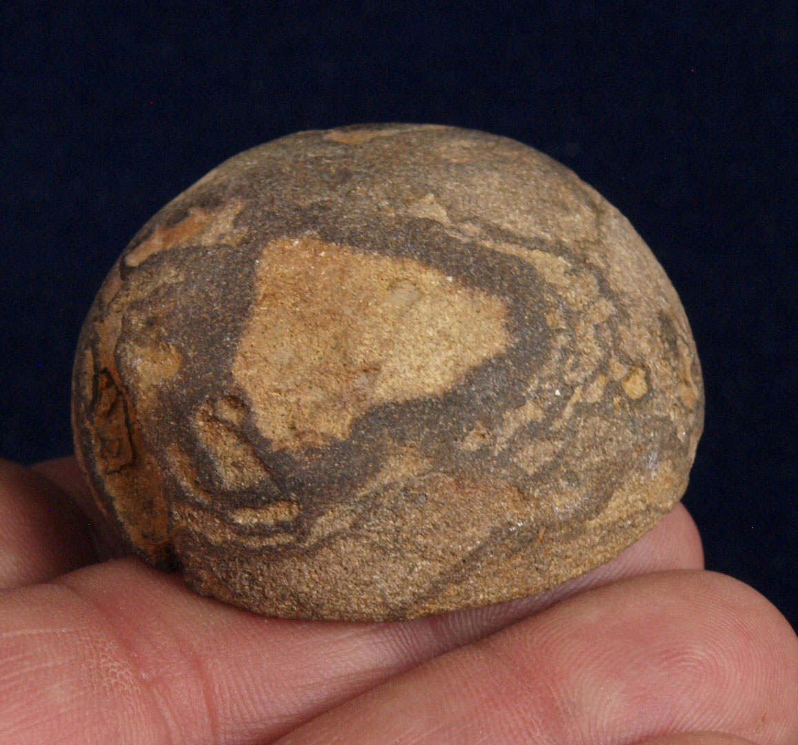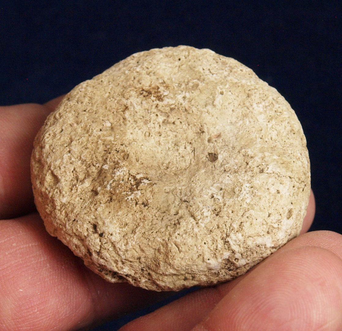 Description: Pecked and dimpled Limestone Discoidal - It was recovered in Lawrence County, Ohio sometime between 1940 and 1960.  From the Boyd Cole Collection of Wayne County, TN.  Ex- B. Kerns, Ex- Monty Pennington