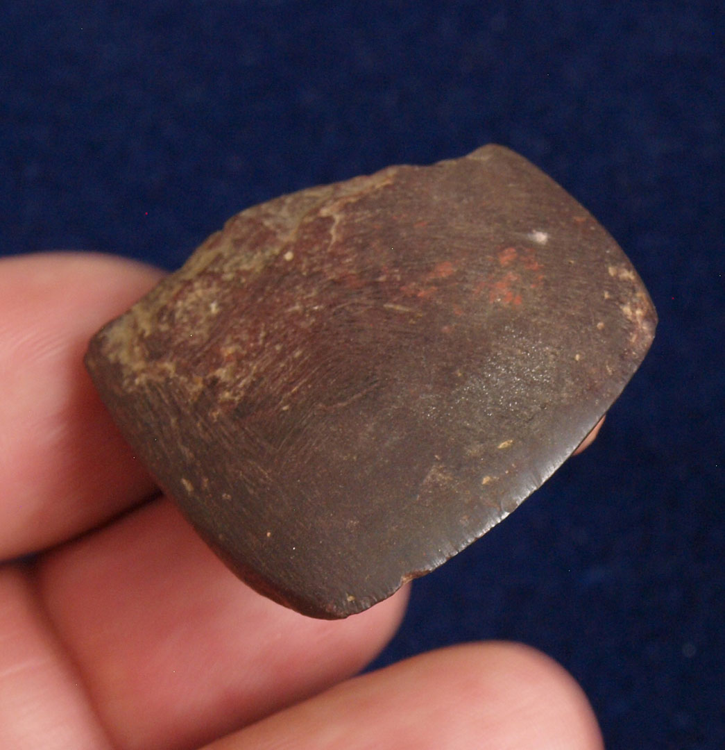 Description: Miniature Hematite Adze - This nice little artifact was found in Lawrence County, Ohio sometime between 1940 and 1960.  It is made from a nice piece of hematite, has a very fine bit and is well polished.  I am calling it an Adz because the bit is beveled from one side and not centered.  Out of the H. Waddell Collection.  Ex- Monty and Jewdy Pennington